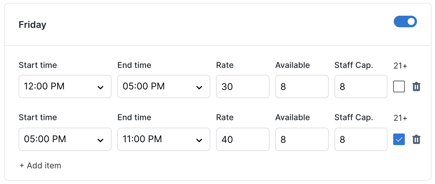 - Rate: This is the price guests will pay when making a reservation on this day and time. If you charge per person then enter the per-person price. If you charge per lane, enter the lane price. If you have not yet set up your pricing model you can do that in global settings.